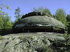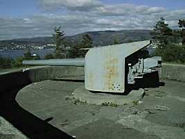 Königsberg managed after a lot of struggle to anchor before it hit the cliffs at Oldernes.(Königsberg was sunk because of heavy damage inflicted on her by British aircraft the next day.) Hellen fort was now ready to pound her guns at the warships, and fired several shots at "Köln". The range had to be estimated from this fort too. All shots missed, and two of the three guns broke down due to technical problems, the last gun received the order to cease firing just as it was beginning to range in on the ships, now clearly visible. The order came as a result of a misunderstanding, and nearly two hours later the fort was again given the order to continue firing! None of the shells from Hellen found its target, and Hellen was shortly after brought to silence by six German bombers. The torpedoes at the torpedo battery were missing their fuses and gyroscopes, and could not be used. The Norwegian torpedo boat "Brand" was hiding in Gravdalsbukten near the east side of Kvarven. The range to the German Warships was 700-1000 meters, and one or several hits would have been assured, still the commander chose to abandon his ship because he felt that the chance of success was so minimal that he would not risk it! The Germans captured his ship intact. Meanwhile the infantry disembarked on the West and East side of Kvarven and were able to take Kvarven fort. At 07:00 Kvarven surrendered. Only two Norwegians were killed, one of them probably by mistake by other Norwegian soldiers , and the other by the Germans, when failing to stop when ordered as he tried to reach his post at the torpedo batteries. One have to include that the failure and mistakes which occured at Kvarven fort, came as a result of little or no training, fresh and "green" gun crews, and old equipment. The commandant Willoch probably did the best he could, considering the limited resources he had at his disposal. ![]() You can clearly see how this gun was placed on a forward facing slope, to make it harder for the invaders to hit their mark. In the foreground, you can see an anti-aircraft gun emplacement, and on the right side, behind the gun, a well armoured command post. |