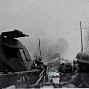 Suddenly hell breaks loose, and the soldiers try to hide behind the panzers. Note the soldier in the background has covered his helmet with a white cloth as camouflage. |