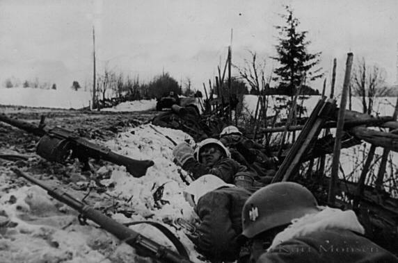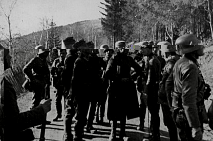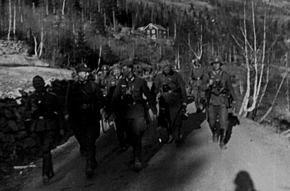 The Germans are not sure if they got every Norwegian out of the woods. The Norwegians had old-fashioned uniforms and often neglect the use of helmets. (It was often missing in the equipment handed out to the soldier.) |