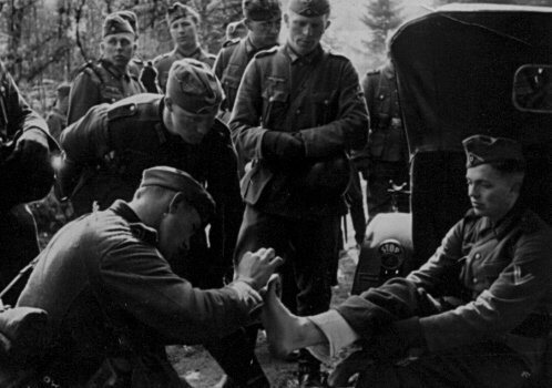 The Norwegians turn in their weapons, bicycles and some even their sleighs! Note that the Germans have captured American trucks. |