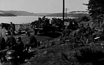 A German infantry unit at rest, while another rushes forward. The Norwegian army must have experienced a terrible time those days. |