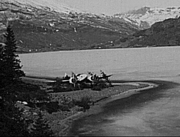 An Italian made aircraft, one of four ordered by the Norwegian air force in 1937. The Ca.310 nr.505 was left behind on the shores of Vangsmjøsa, and badly camouflaged with some trees and bushes. It was probably very dark when the pilots did this, in the daylight it actually added more attention to the area! |