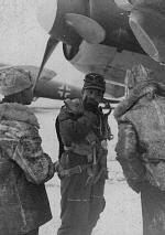 One of the crew members on a Ju-88 ready for boarding, is giving the last minutes report to the ground crew. Note the winter clothing of the ground crew with no military patches. The rank and branch patches were often painted on by the owners. |