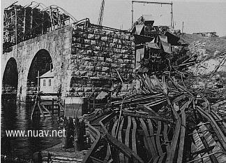 The once so solid railway bridge has collapsed, and the sleepers has taken shape of a modern artwork, presumably not enjoyed by the germans. |