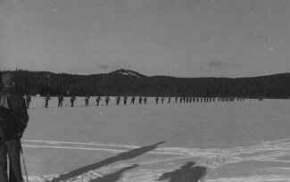 A Norwegian police unit is crossing a frozen lake somewhere in Sweden. | |